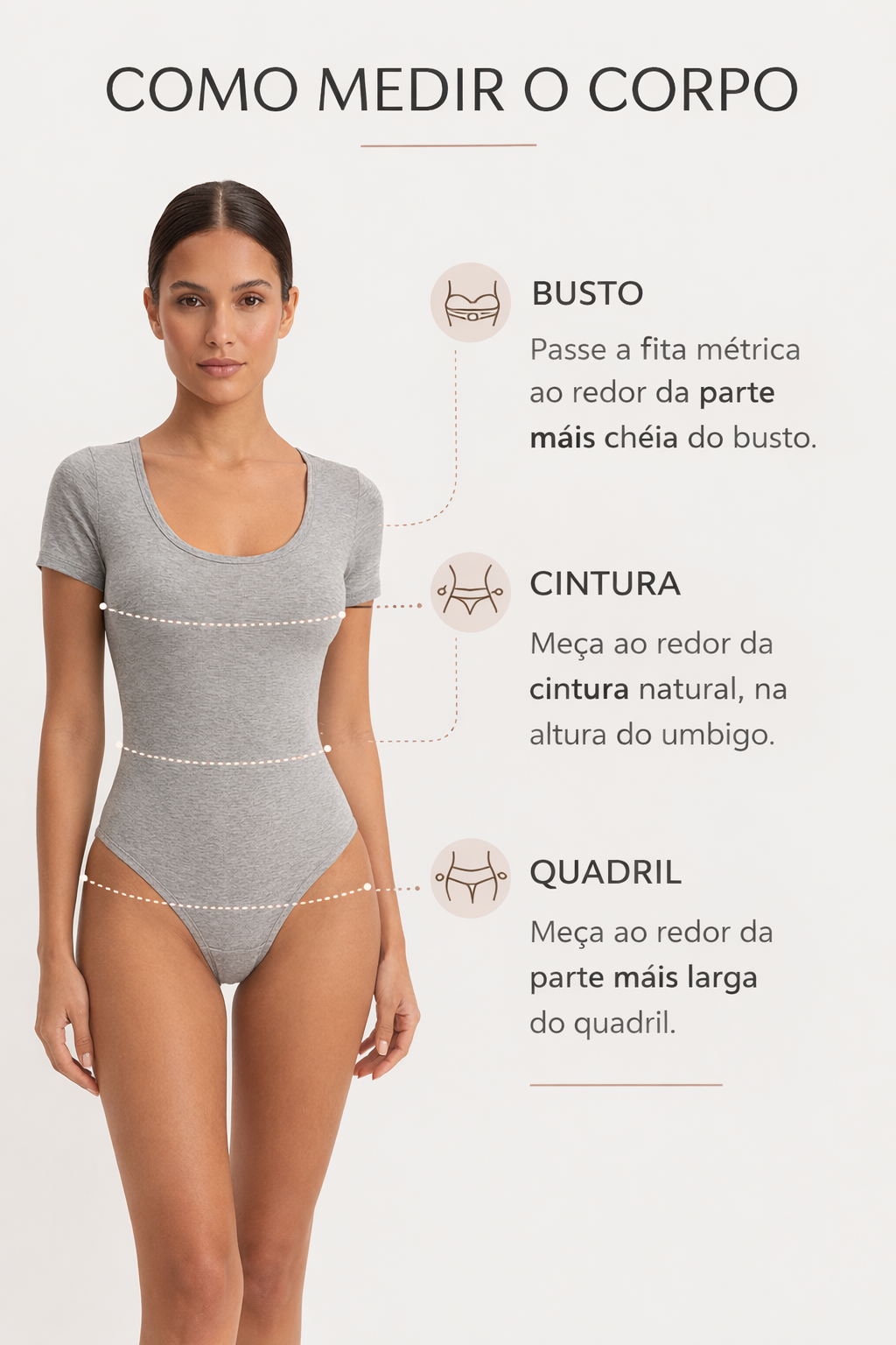 Com modelagem ajustada ao corpo, manga curta e decote redondo, este body foi desenvolvido para valorizar a silhueta com conforto e elegância. A modelagem asa delta alonga visualmente as pernas e destaca o quadril, criando um caimento moderno e feminino.